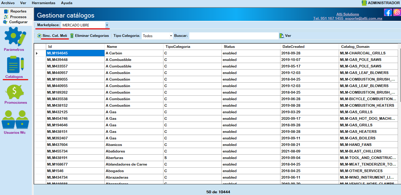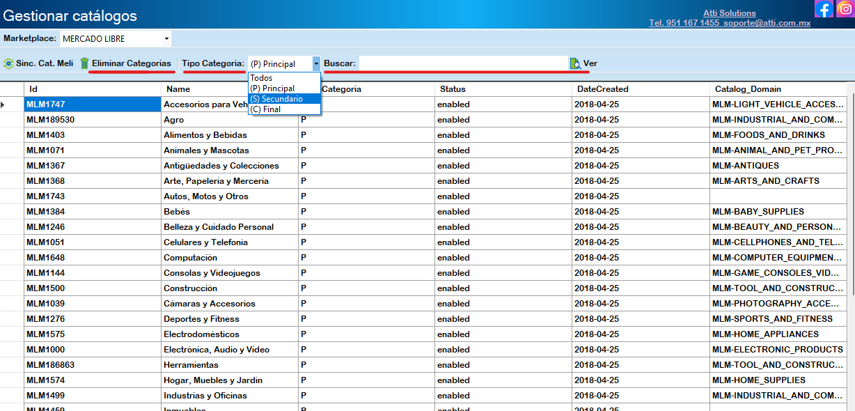El catálogo de categorías y atributos de Mercado Libre ya viene predefinido. Al completar la descarga del catálogo completo, disponemos de la opción de Eliminar catálogo y buscar categorías utilizando el filtro de Tipo categoría. Para encontrar la categoría a la que pertenece tu artículo, simplemente ingresa la categoría y haz clic en «Ver».