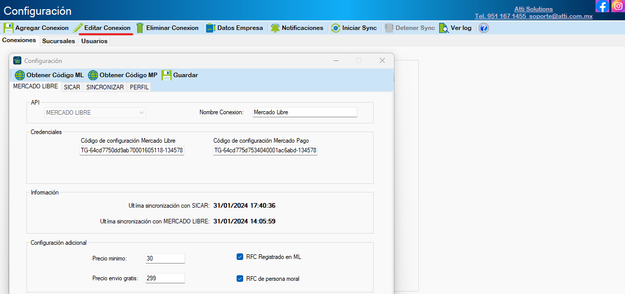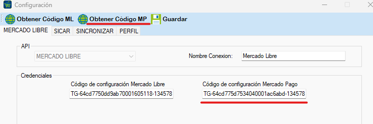 A continuación, en la sección de MERCADO LIBRE, ingresa el Código de configuración Mercado Libre y Código de configuración Mercado Pago. Es importanteque la cuenta principal de mercado libre este abierto.