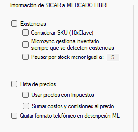 En la sección Información de ERP a MERCADO LIBRE, marca las casillas que se sincronizarán del sistema ERP a MERCADO LIBRE.