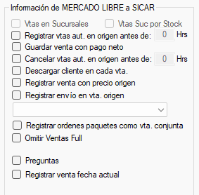 En la sección Información de MERCADO LIBRE a SISTEMA ERP, marca las casillas que se sincronizarán de MERCADO LIBRE a SISTEMA ERP.