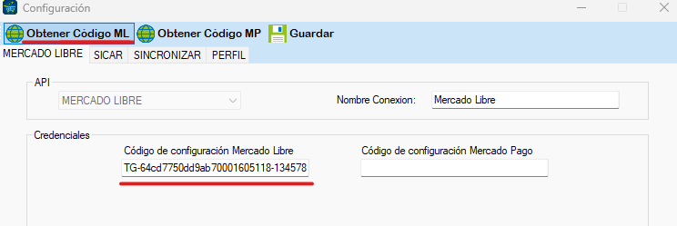 Para obtener el Código de configuración Mercado Libre, presiona en Obtener Código ML