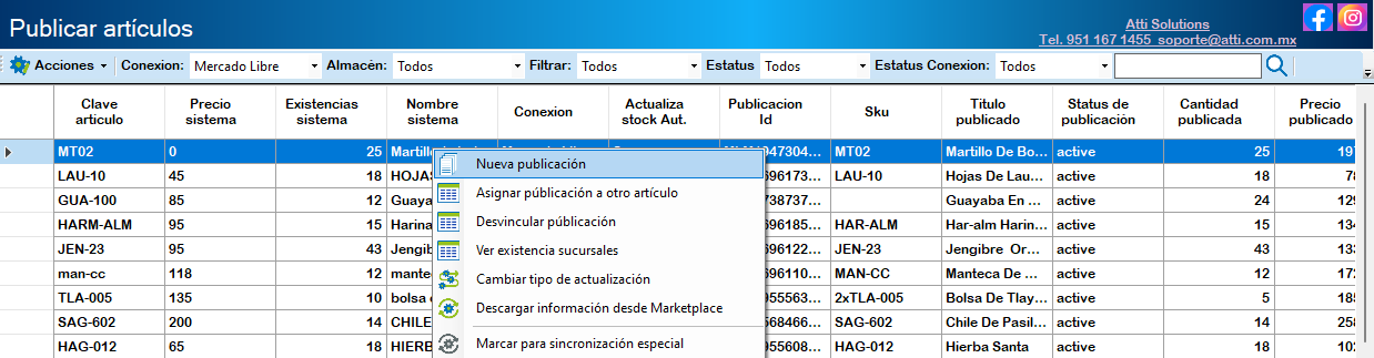 Para Publicar un artículo nuevo desde  Microzync hacia Mercado libre haz clic derecho sobre el artículo y selecciona “Nueva Publicación”.