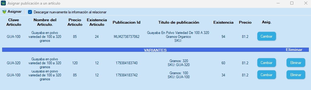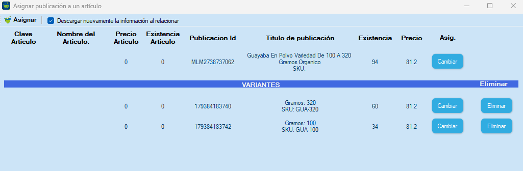 Si su publicación tiene variantes, le mostrará el artículo y sus variantes, haz clic en «Cambiar» para buscar un artículo y asignar a una publicación, puede cambiar la asignación del artículo y sus variantes.