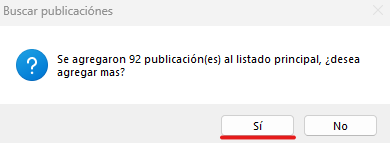 Seleccione los artículos que desea incluir en el listado personalizado que se va a descargar y luego haga clic en «Agregar». Posteriormente, presione «Sí» si desea agregar más publicaciones, o presione «No» para continuar.