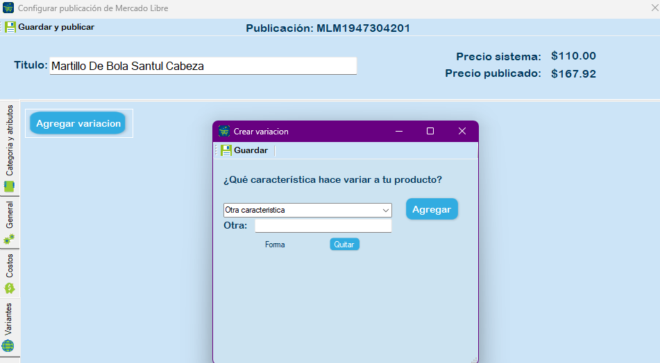A continuación, se te mostrará la variante y sus atributos. También puedes hacer clic en «Quitar Variante» si es necesario. Una vez que hayas terminado de configurar la publicación en Mercado Libre, presiona «Guardar y Publicar».