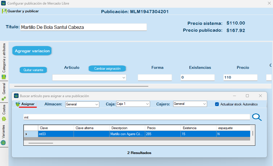 Especifica el artículo de tu sistema ERP que deseas asignar a una publicación de  Mercado Libre y haz clic en «Asignar». En este mismo lugar, puedes realizar cambios, como seleccionar otro almacén, caja o cajero para almacenar las ventas del artículo. Además, tienes la opción de desmarcar la casilla de stock automático para evitar la sincronización automática del inventario.