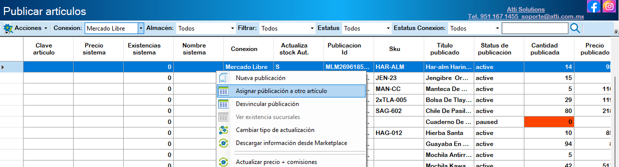 Para relacionar una publicación de Mercado libre  con un artículo del sistema ERP, haz clic derecho sobre el artículo y elija la opción Asignar publicación a otro artículo o haz doble clic sobre el artículo.