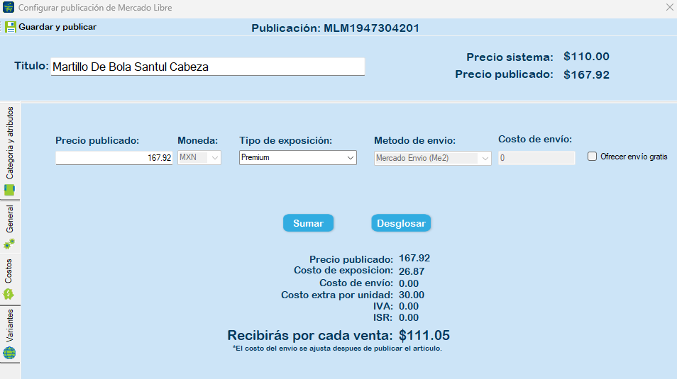 Costos: Permite ingresar precio publicado, tipo de exposición, método de envió, costo de envió y ofrecer envió gratis.