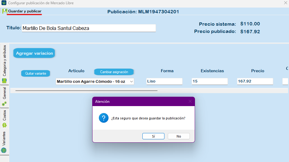 Después de hacer clic en «Guardar y Publicar», haz clic en «Sí» para publicar tu artículo en Mercado Libre.