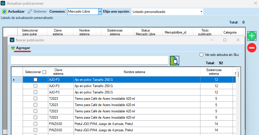 Para descargar una publicación personalizada, es importante que la publicación esté previamente asignada a un artículo del sistema ERP. En consecuencia, haz clic en el icono verde. Ingresa el nombre del artículo o utiliza la lupa para encontrar los artículos relacionados. Después, los artículos se mostrarán en la lista de actualización personalizada.