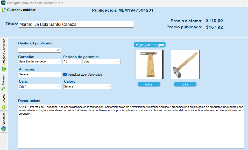 General: Permite ingresar la cantidad publicada, garantía, almacén, caja, cajero, descripción, periodo de garantía, agregar una o más imágenes y actualizar el stock automático.