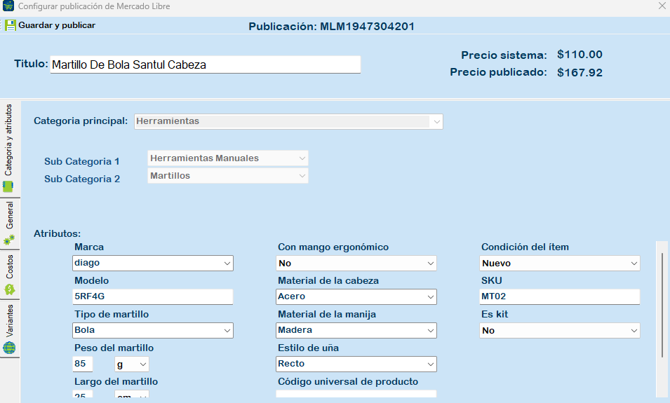 Categoría y atributos: Permite configurar la categoría principal, las sub categorías y los atributos, configure correctamente la información que solicita mercado libre para publicar su artículo.