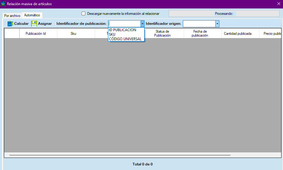 La segunda opción es en la sección Automático, donde puede elegir como se van a relacionar los artículos, seleccionando el Identificador de publicación y el Identificador origen.