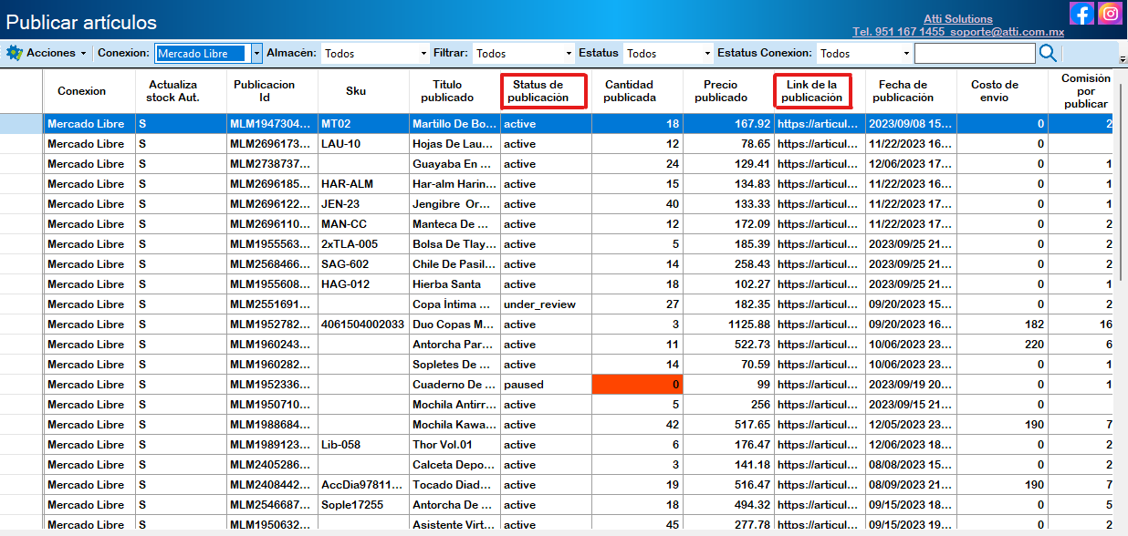 Activos: Se muestran todos los artículos publicados en Mercado Libre activos.
