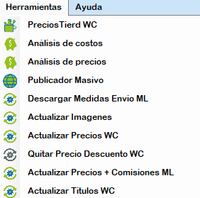 En la parte superior de Microzync, encontrará la opción de «Herramientas», donde verá diferentes opciones como Precios Tierd WC, Análisis de costos, Análisis de Precios, Publicador Masivo, Descargar Medidas Envío ML, Actualizar Imágenes , Actualizar Precios WC, Quitar Precio Descuento WC, Actualizar Precios + Comisiones ML, Actualizar Títulos WC.