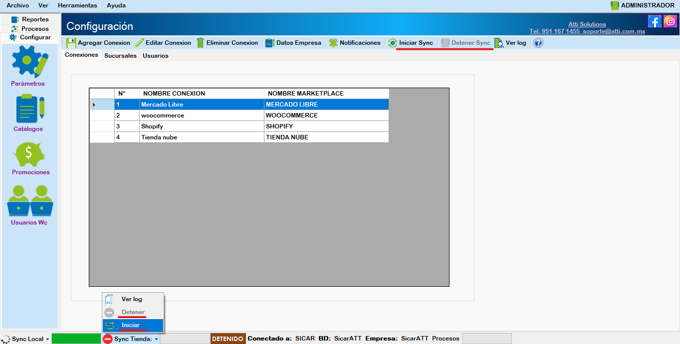 Iniciar Sync: Inicia la sincronización para actualizar existencias, precios y descarga las ventas del Marketplace conectado.