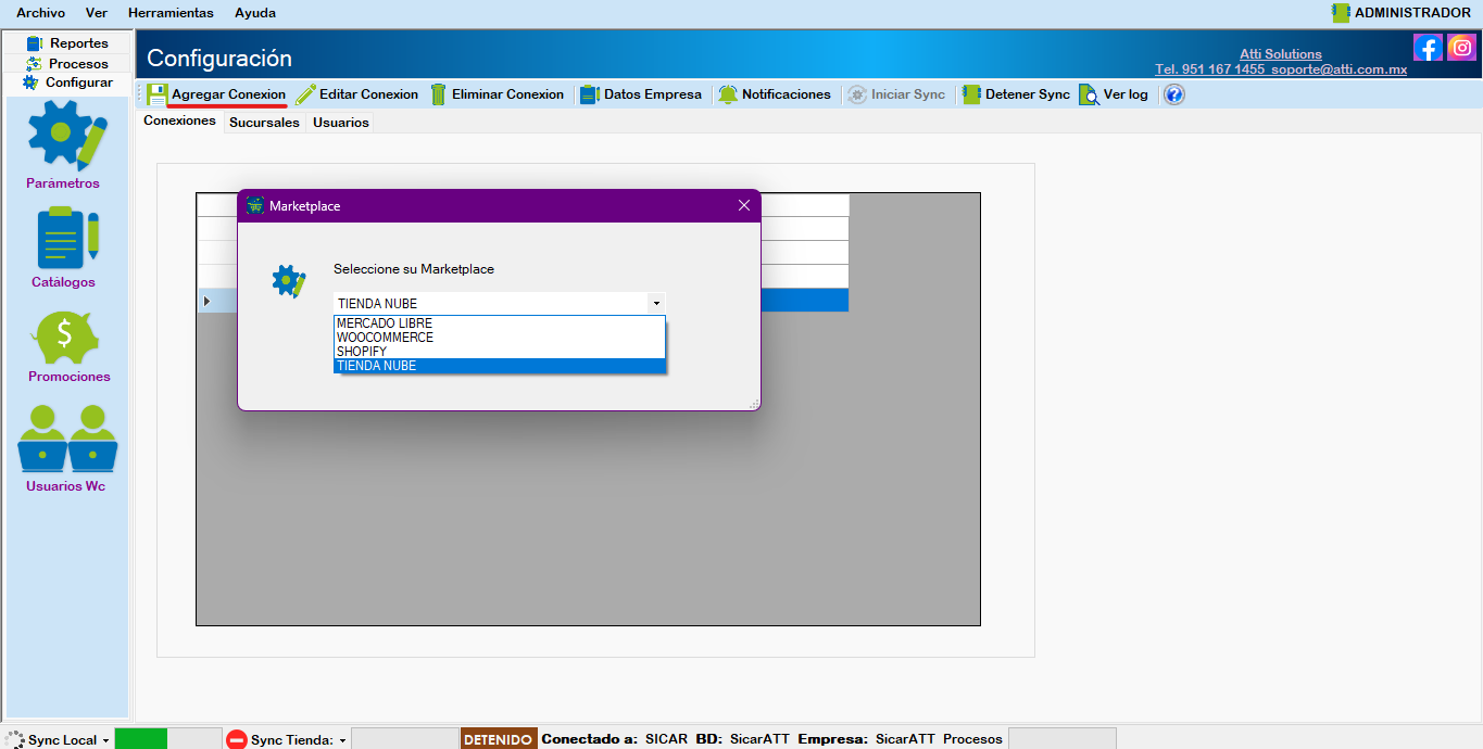 Para habilitar el uso del sistema Microzync, sigue estos pasos, realiza la configuración en la sección de Configurar → Parámetros y Selecciona «Agregar Conexión», elige Marketplace > Tienda Nube.