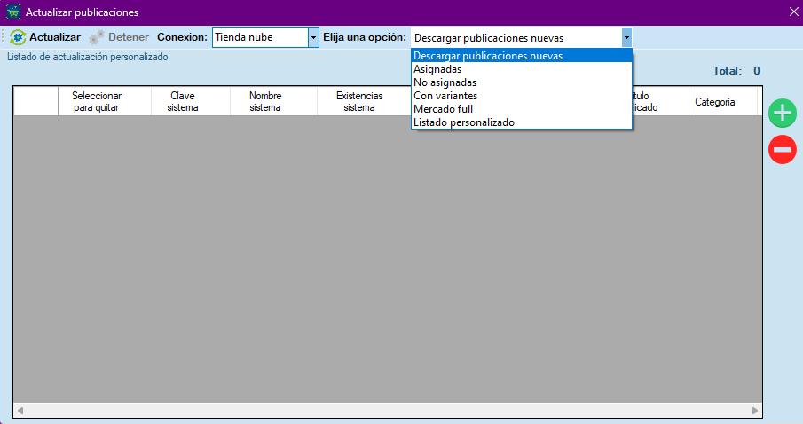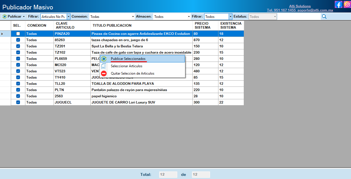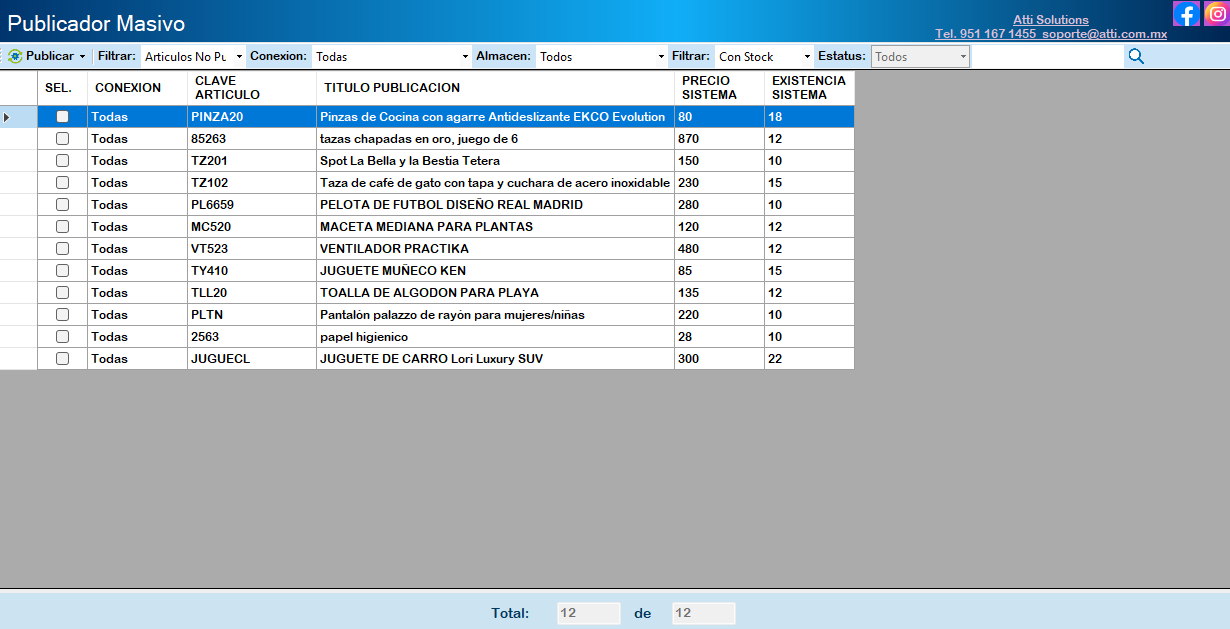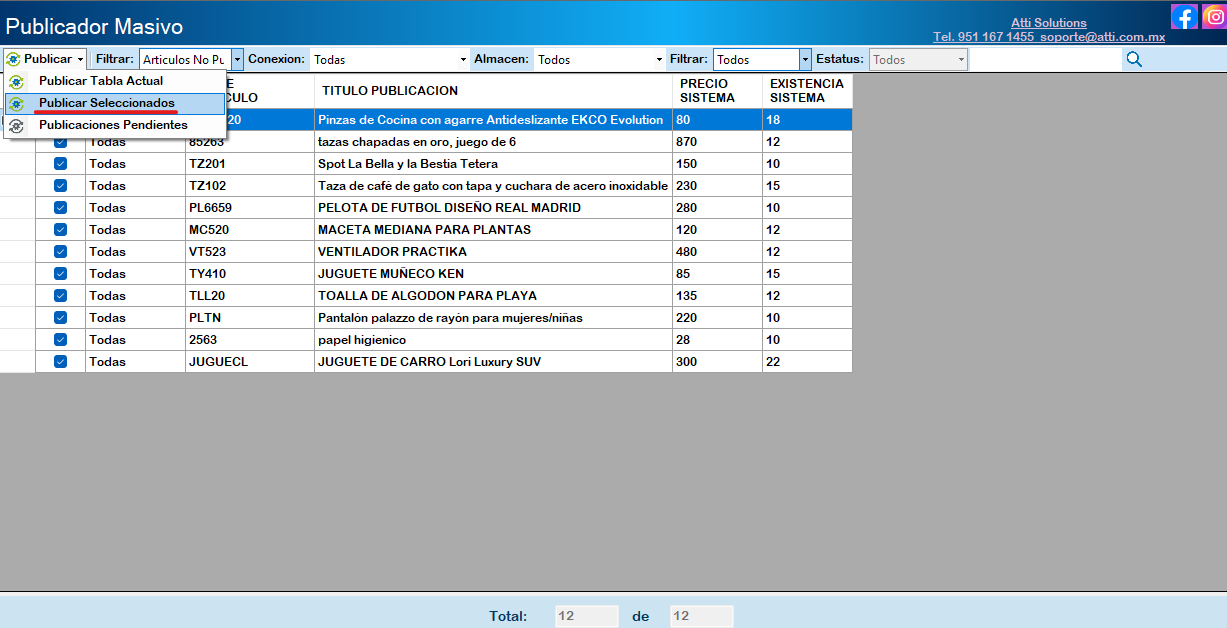 A continuación, se mostrará la ventana del Publicador Masivo con el filtro de artículos no publicados y con stock.