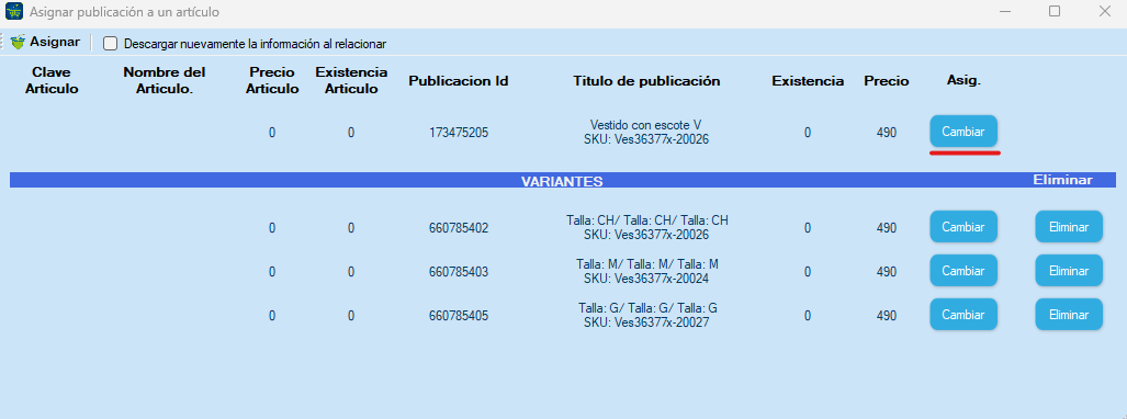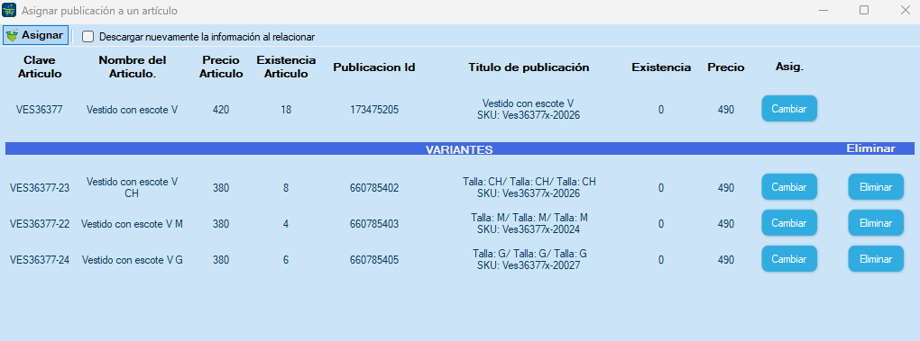 Variantes: Después de agregar los atributos, haz clic en la opción «Agregar Variante» y luego en «Cambiar Asignación» para vincular el artículo con sus variantes. Posteriormente, haz clic en «Asignar» para agregarlas. Continúa con el mismo proceso para incluir más variantes.