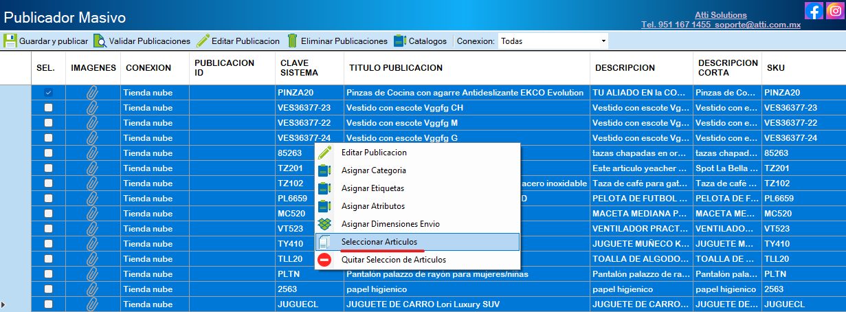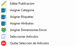Al realizar clic derecho sobre el artículo en esta vista del publicador masivo, se mostrarán las siguientes opciones: Editar Publicación, Asignar Atributos, Asignar Etiquetas, Asignar Categoría, Asignar Dimensiones de Envío, Seleccionar artículos y Quitar artículos. Cada opción seleccionada le mostrará la interfaz correspondiente para editar únicamente esa opción.