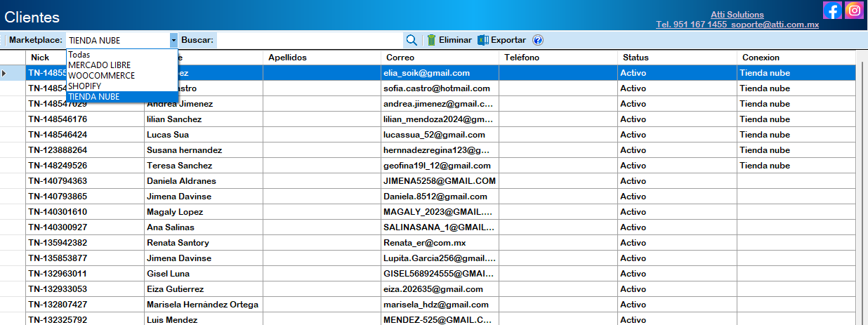 Selecciona «Tienda Nube» en el Marketplace para ver a tus clientes. En caso de tener más conexiones, puedes seleccionar por conexión o ver los clientes de todas ellas. Para buscar a un cliente, ingresa el nombre del cliente que deseas buscar y haz clic en la lupa.