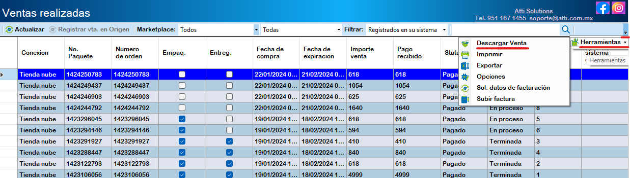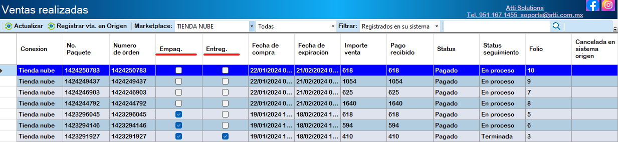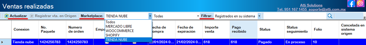 En la vista se exhibe el nombre de la conexión, número de paquete y orden, fecha de compra y de expiración, importe de la venta, pago recibido, estado de la venta, estado de seguimiento, folio de registro en el sistema ERP. Si la venta fue cancelada en su sistema ERP, se marcará con una «S» en la columna «Cancelada en sistema origen».