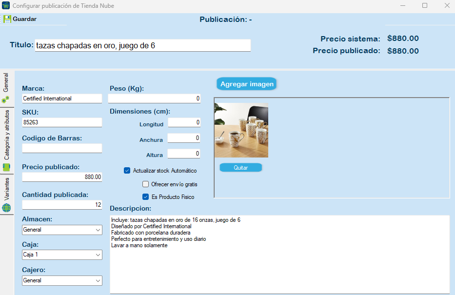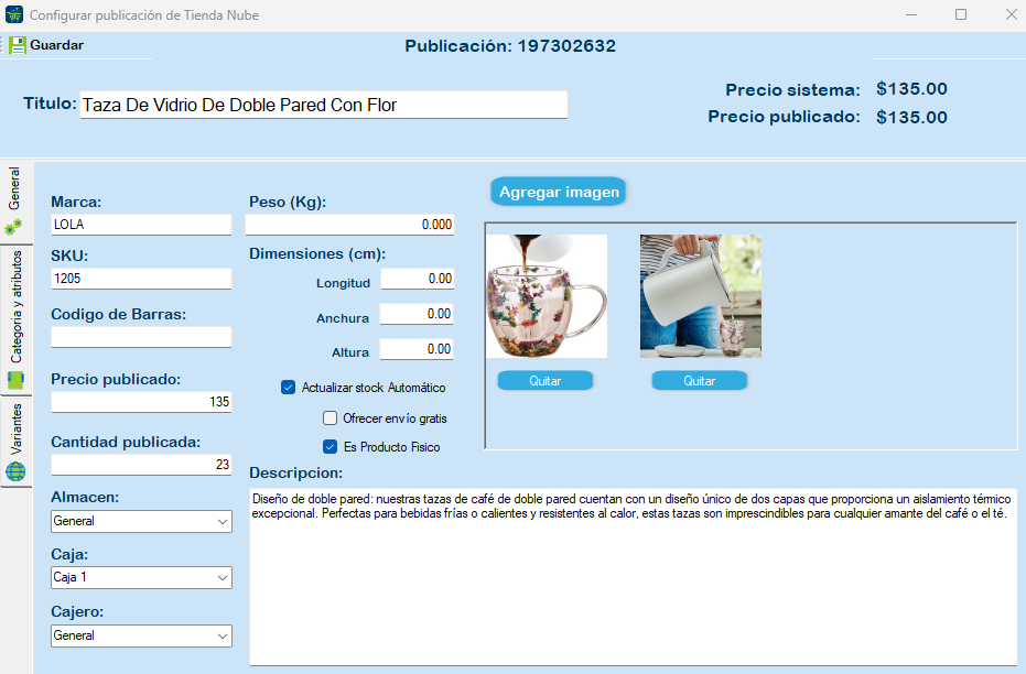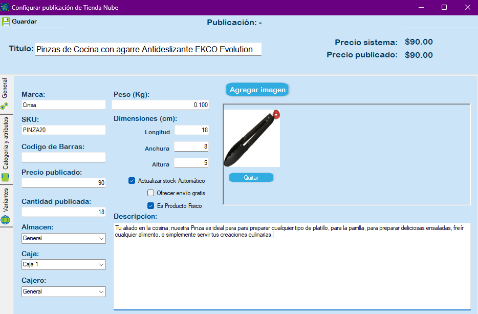 General: Permite editar la Marca, Peso (kg), SKU, Código de barras, Precio publicado, Cantidad Publicada, Almacén, Caja, Cajero, Descripción y Agregar Imagen. Es importante activar el marcador de Actualizar stock Automático y asegurarse de que el producto sea físico.