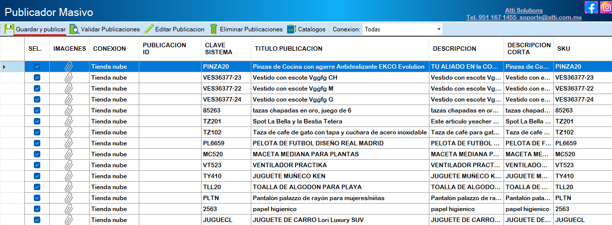 En la parte superior de la tabla, encontrará las opciones de «Guardar y Publicar», «Validar Publicaciones», «Editar Publicación», «Eliminar Publicaciones», «Catálogos» y la opción para seleccionar conexión en caso de tener más.