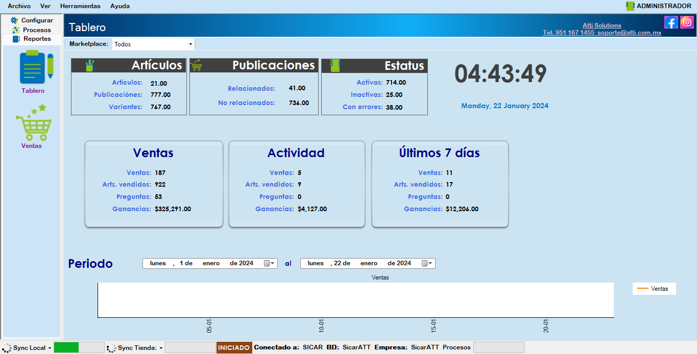 En la sección de Reportes > Tablero, podrás visualizar un resumen general de Artículos, Publicaciones, Estatus, Ventas, Actividad y Últimos 7 días, junto con una gráfica de Ventas.