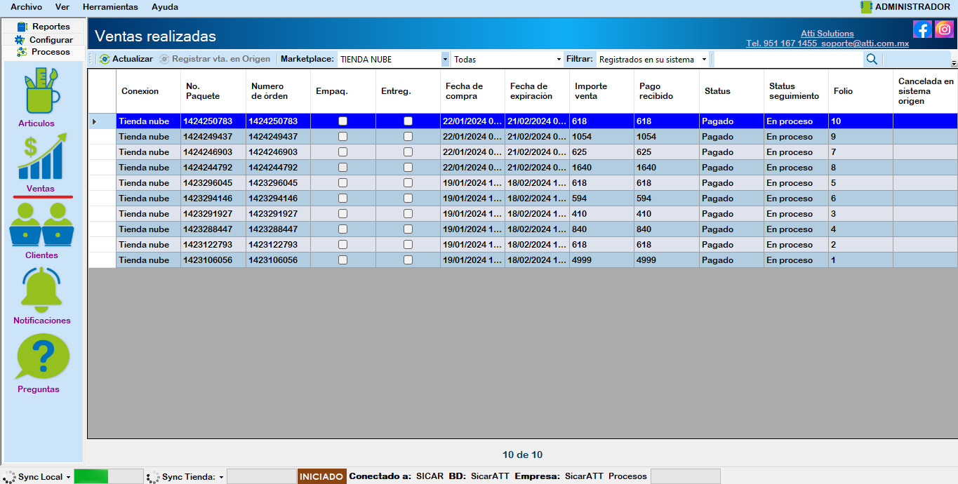En la sección Procesos → Ventas, se pueden visualizar todas las ventas que se van descargando de su tienda, solamente las ventas completadas se registran en su sistema ERP y se descuenta en el inventario.