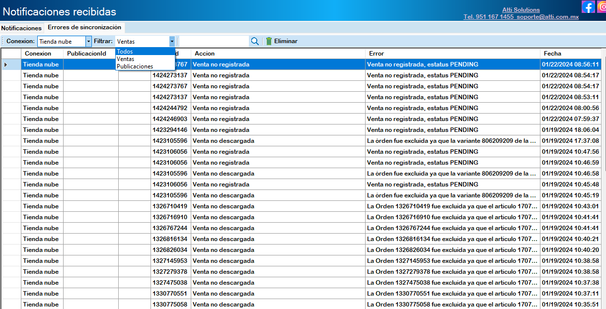 En la sección Procesos > Notificaciones, podrás visualizar las notificaciones generadas por Tienda Nube. Dentro de esta sección, encontrarás la pestaña de «Errores de Sincronización», que muestra los errores de publicaciones al sincronizarlos hacia Tienda Nube. Además, también muestra los errores al descargar o registrar una venta, proporcionando los datos de la venta y el motivo del error.