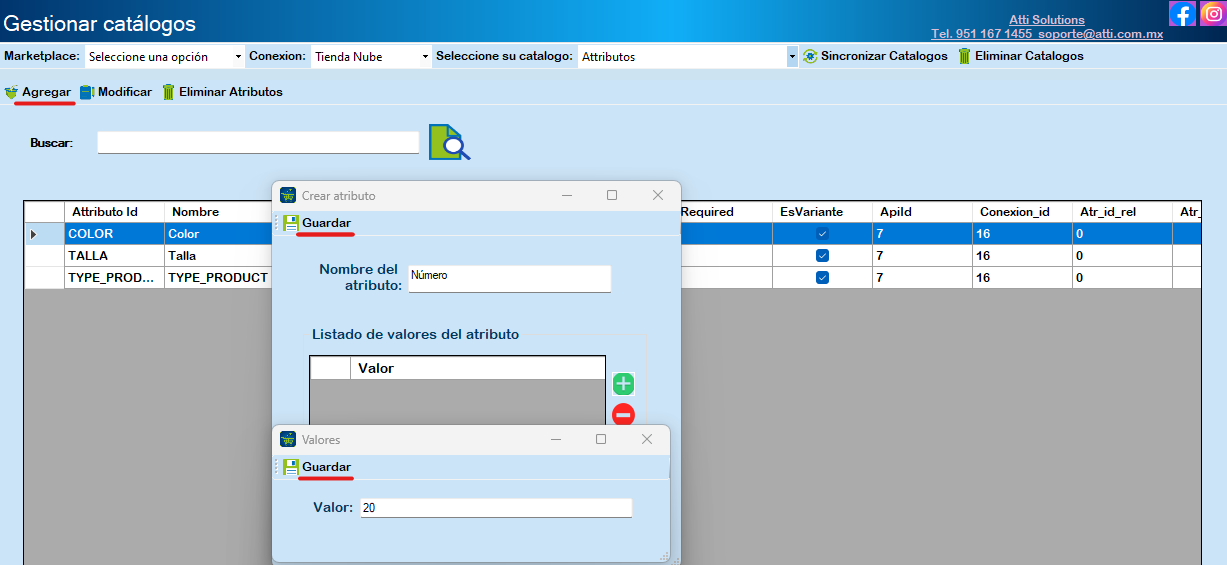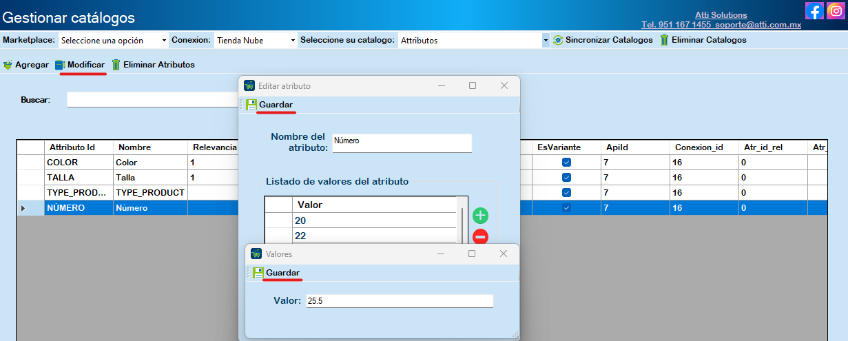 Para editar un atributo haga clic en «Modificar», podrá quitar valores o agregar más valores al atributo, al terminar presione en «Guardar».