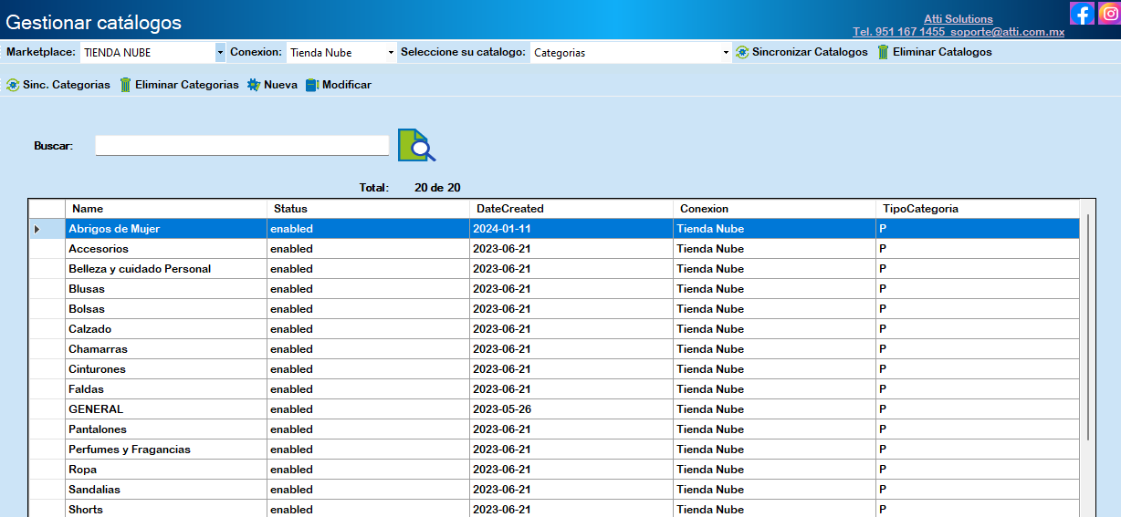 Catálogos: Muestra el catálogo sincronizado de Tienda Nube, permitiendo agregar o eliminar opciones que se muestren en el catálogo.
