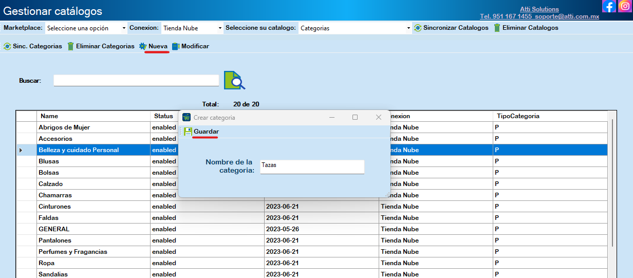 Para agregar una nueva categoría, haz clic en ‘Nueva’, ingresa el nombre de la categoría y haz clic en ‘Guardar’. El sistema te enviará un mensaje de confirmación, ¿Estás seguro de querer guardar la categoría ‘Tazas’? Por favor, responde ‘Sí’ para continuar.