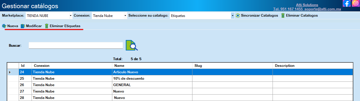Nueva: Haga clic sobre esta opción para agregar nuevas etiquetas.