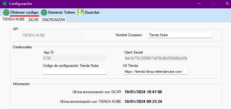 Copie el código de acceso generado y péguelo en el campo correspondiente de “Configuración de Tienda Nube”. Luego haga clic en «Generar Token» y posteriormente en «Guardar» para avanzar con la configuración.