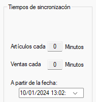 En la sección Tiempos de sincronización, específica cada que tiempo se van a sincronizar artículos y cada que tiempo se van a sincronizar ventas y a partir de qué fecha se sincronizarán sus ventas e inventarios con su tienda, para no sincronizar ingresa 0 en tiempo.