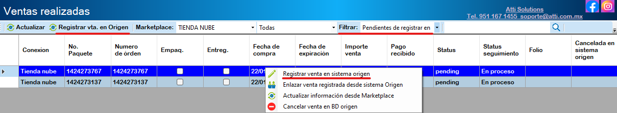 Al ingresar en pendientes de registrar habilita la opción de Registrar vta. En Origen, en esta opción te registra todas las ventas que se encuentren en la tabla por lo que al hacer clic derecho sobre una venta te permite registrar solo esa venta con la opción de Registrar venta en sistema origen.