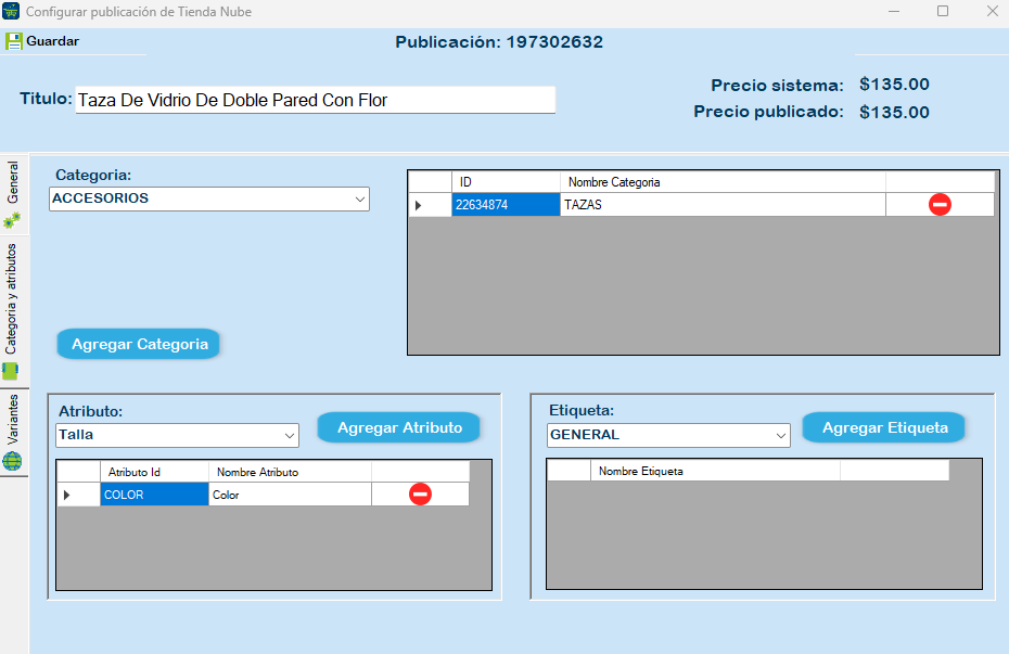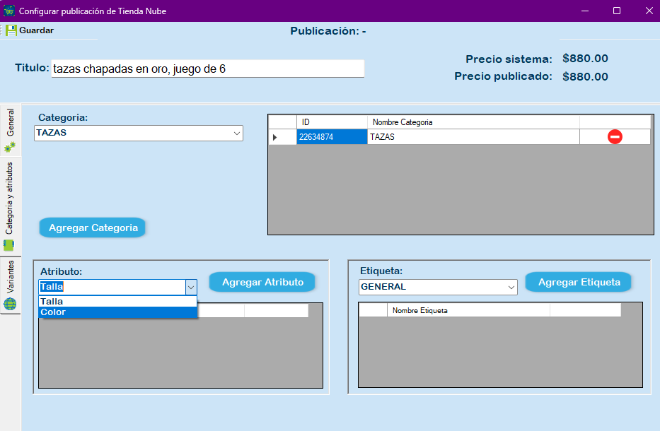 A continuación, se te mostrará la sección de General, Categoría y Atributos, Variantes.