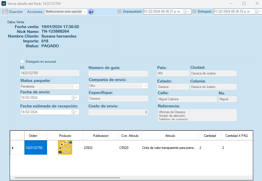 Para visualizar el detalle de la venta, haz doble clic sobre la venta, se mostrará los datos de la venta, así mismo en Acciones, puede elegir las opciones Entregué el producto, Envié el producto o Cancelar la venta y haz clic en Guardar.