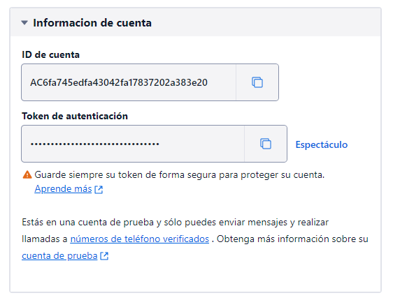 Paso4.- En información de la cuenta copiar ID de cuenta y Token de autentificación.