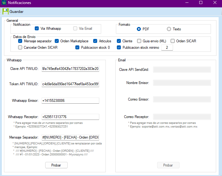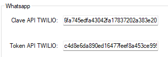Paso5.- Pegar las claves en los campos de Notificaciones de Clave API TWILIO y Token API TWILIO