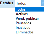 Estatus: En la opción de Estatus, los productos que visualizará están las opciones TodosActivosPend. PublicarPausadosInactivos y Eliminados.