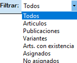 Filtrar: En la opción de Filtrar, los productos que visualizará están las opciones TodosArtículosPublicacionesVariantesArts. Con existenciaAsignados y No asignados.