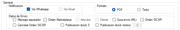 • Seleccionar los datos de envío que se desea recibir como notificación las opciones son: Mensaje separador, Orden Marketplace, Artículos, Cliente, Guía envío (ML), Orden en Sistema ERP, Cancelar Orden en Sistema ERP, Publicación stock 0, Publicación stock mínimo (Cantidad que se considera mínima en existencia)