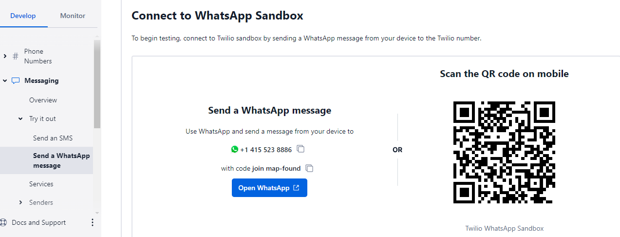Paso3.- Agregar el número de WhatsApp que Twilio proporciona o conectarse mediante Código QR en Twilio y envíe el mensaje de código para la conexión.