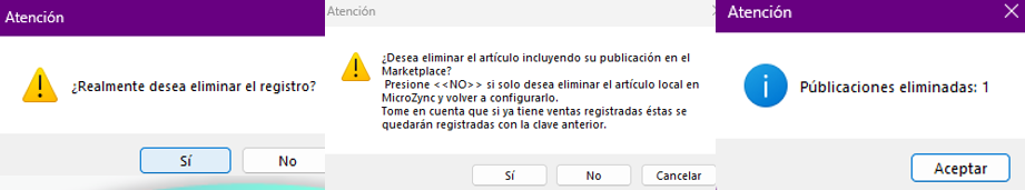 Eliminar un artículo: Para eliminar un producto, dirígete en Acciones y haz clic en Eliminar, posteriormente se le preguntará, si desea eliminar el producto, haz clic en , para eliminar, por último, haz clic en , si desea eliminar el artículo incluyendo su publicación en WooCommerce, haz clic en No, si desea eliminar el artículo local en Microzync y volver a configurarlo.