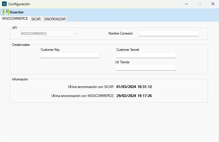 A continuación, en la sección de WOOCOMMERCE, ingresa la clave de Customer Key y la clave de Customer Secret de WooCommerce, así como la Url de la tienda en Url Tienda.