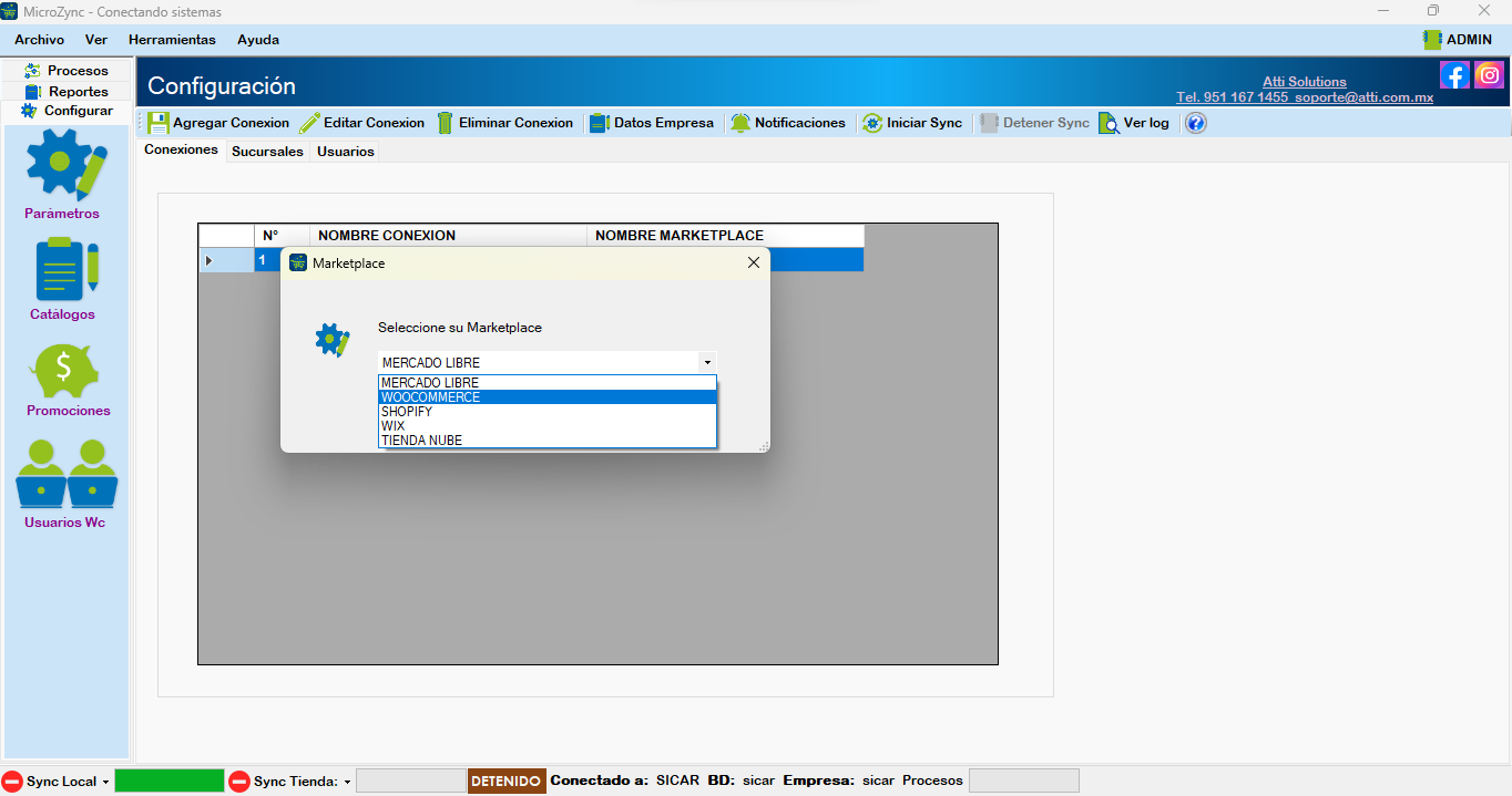 Para habilitar el uso del sistema Microzync, sigue estos pasos, realiza la configuración en la sección de Configurar → Parámetros y Selecciona «Agregar Conexión», elige Marketplace > WooCommerce.