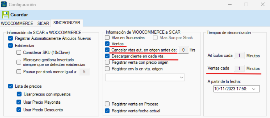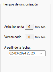 En la sección Tiempos de sincronización, específica cada que tiempo se van a sincronizar artículos y cada que tiempo se van a sincronizar ventas y a partir de qué fecha se sincronizarán sus ventas e inventarios con su tienda, para no sincronizar ingresa 0 en tiempo.